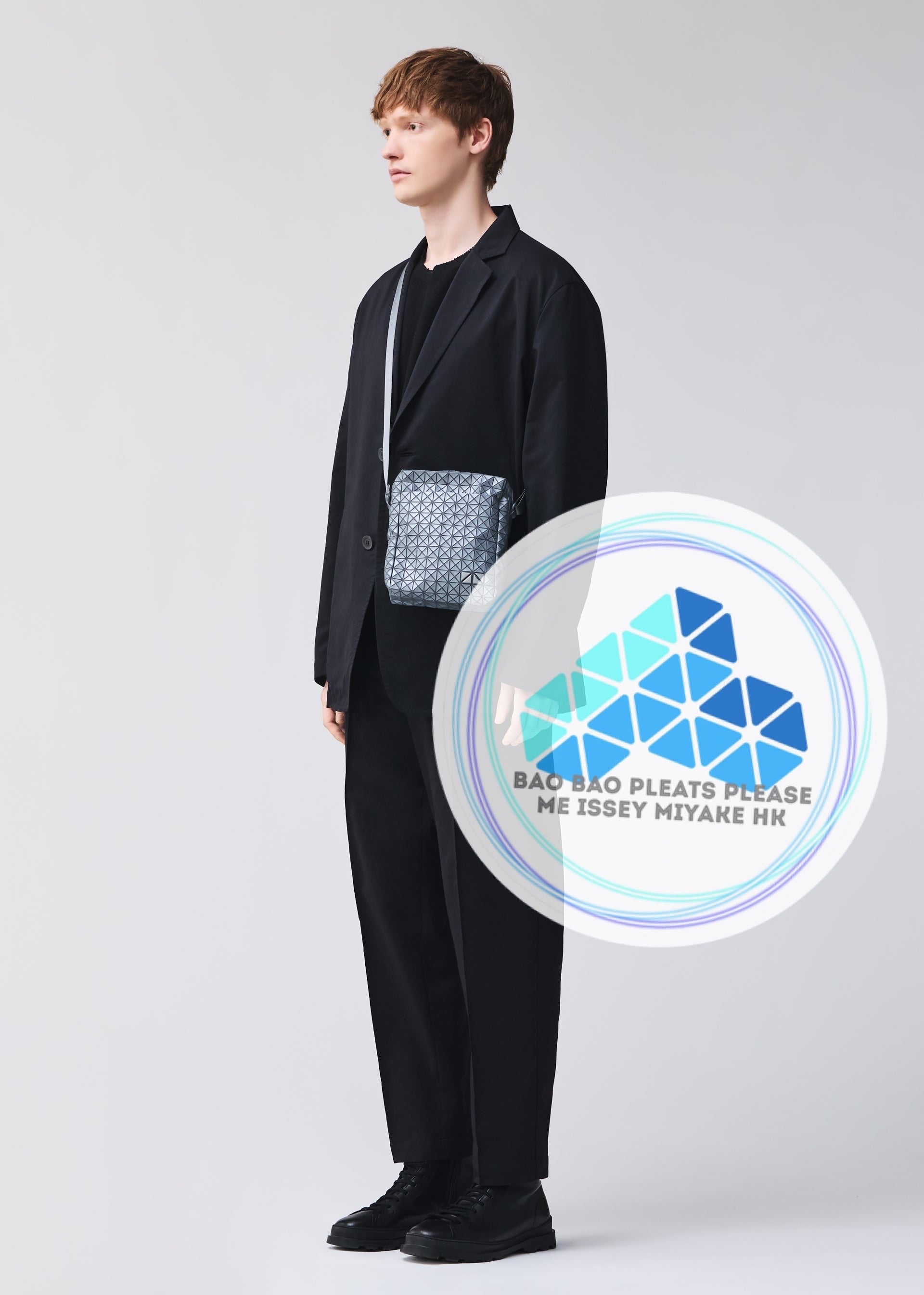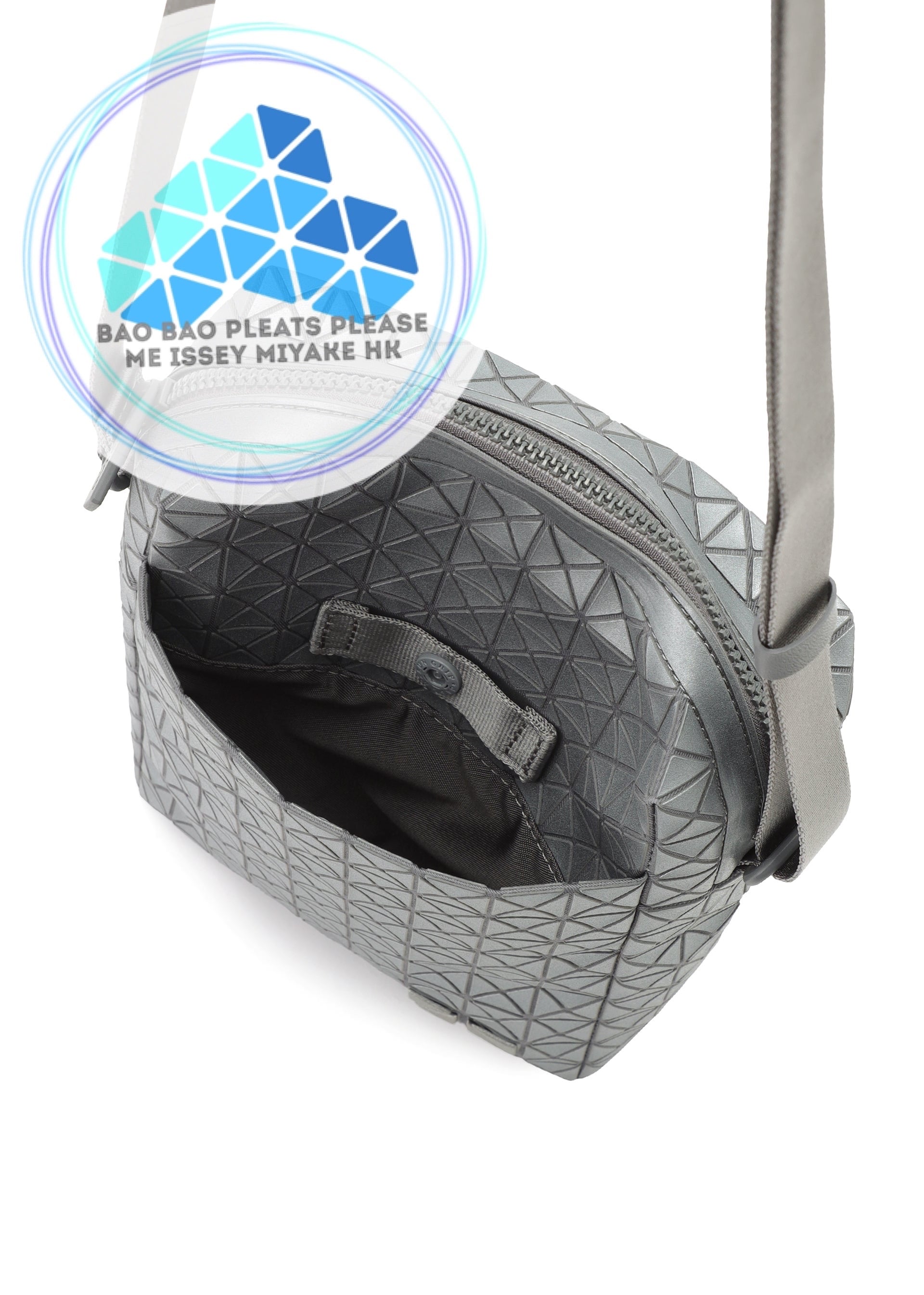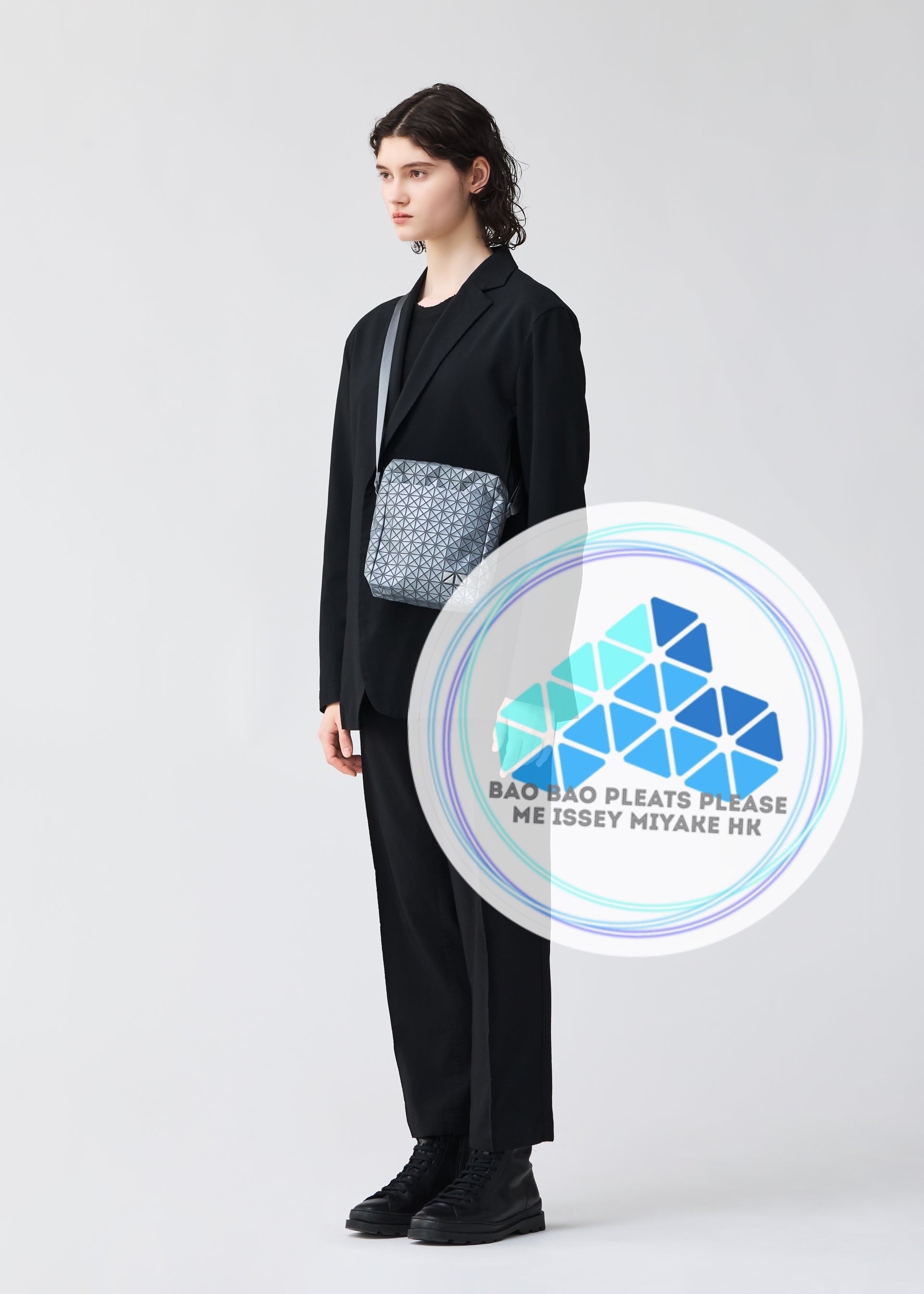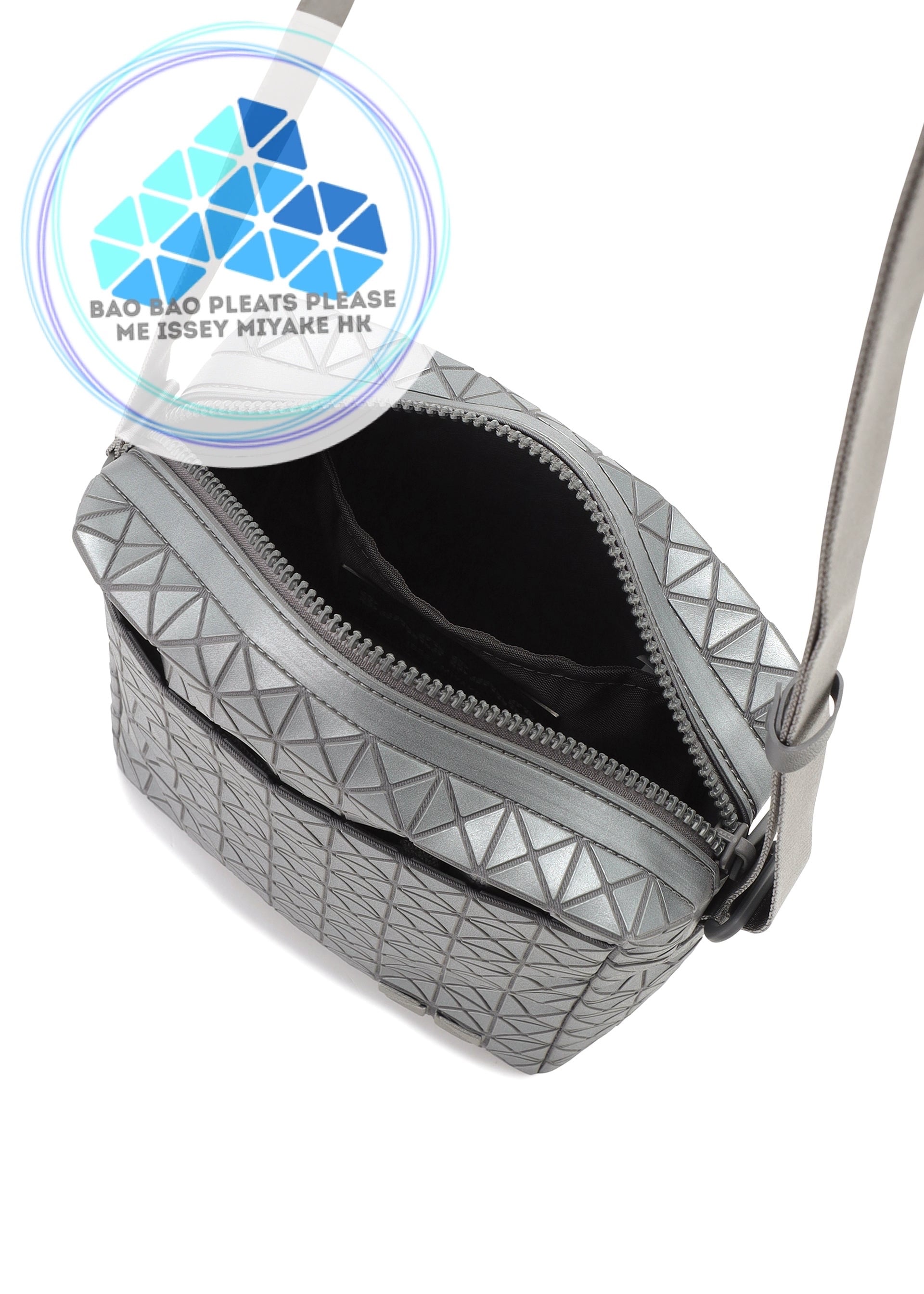 KURO系列竪版斜孭袋的三角珠片採用反光材料,在暗處經光線照射後,整個袋身會發生三維反射。在亮處則呈現金屬般的質感。外側口袋設有磁吸扣,可放心收納貴重物品。其設計非常便利,可竪著放入塑料瓶、水杯,亦可收納智能手機、錢包等物品。